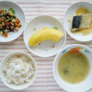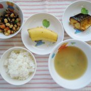 ごはん 焼き魚(鯖) 大豆のひじき煮 具だくさん味噌汁 果物(バナナ)