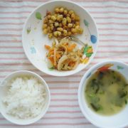 ごはん 豚肉の生姜焼き 大豆の青のり揚げ 味噌汁 小魚
