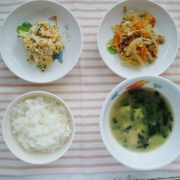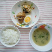 ごはん 鶏肉とゆで卵のさっぱり煮 小松菜のツナ和え 味噌汁