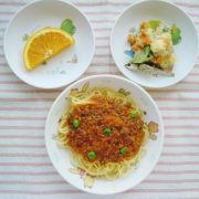 ミートスパゲティー ゆで野菜サラダ 果物(オレンジ) 小魚