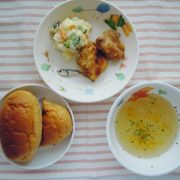 ロールパン 照り焼きチキン ポテトサラダ コンソメスープ 小魚