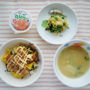 鶏肉の照りマヨ丼 キャベツと小松菜の和え物 味噌汁 ゼリー 小魚