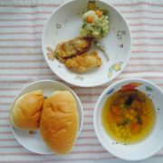 ロールパン タンドリーチキン ゆで野菜サラダ コンソメスープ 小魚