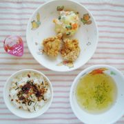 ☆誕生会☆ ふりかけごはん 鶏肉の唐揚げ マセドアンサラダ コンソメスープ チュルルン