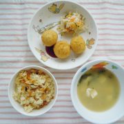 炊き込みご飯 里芋のコロコロチーズ揚げ 切り干し大根のサラダ 味噌汁 小魚