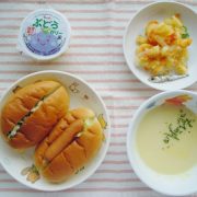ホットドッグ ロールサンド じゃがいものソテー コーンスープ ゼリー 小魚
