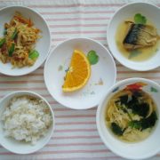 麦ごはん さばの味噌煮 切干大根煮 かき玉汁 果物(オレンジ)