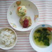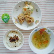 ☆誕生会☆ ふりかけごはん 鶏肉の唐揚げ マセドアンサラダ 春野菜スープ チュルルン