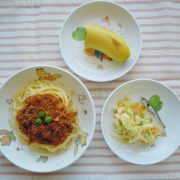 ミートスパゲティー キャベツとコーンのサラダ 果物(バナナ) 小魚