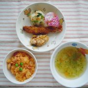 ☆こどもの日ランチ☆ ケチャップライス エビフライ 鶏肉の唐揚げ 小松菜のツナ和え 春野菜スープ チュルルン