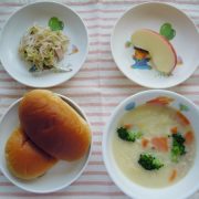 ロールパン クリームシチュー 三色サラダ りんご 小魚