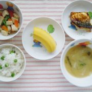 えんどう豆ごはん 焼き魚(鯖) 高野豆腐煮 味噌汁 バナナ