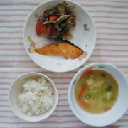 麦ごはん 焼き魚(鮭) 筑前煮 具だくさん味噌汁