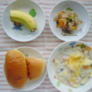 ロールパン マカロニグラタン 三色サラダ 果物(バナナ) 小魚