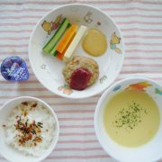 ☆お誕生日会☆ ふりかけごはん ハンバーグ 野菜の味噌マヨディップ スキムコーンスープ チュルルン