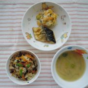 炊き込みご飯 焼き魚(鯖) 大根サラダ 味噌汁