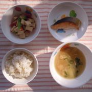 麦ごはん 焼き魚(鮭) 高野豆腐煮 味噌汁