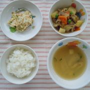 ごはん 豚肉じゃが 切干大根のサラダ 味噌汁 小魚
