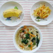 けんちんうどん 野菜かきあげ 果物(バナナ) 小魚