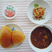 ロールパン ビーフシチュー 三色サラダ ゼリー 小魚