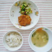 麦ごはん ごぼうつくね揚げ 小松菜とキャベツのジャコ和え 味噌汁