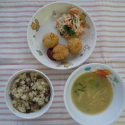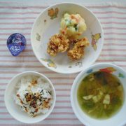 ☆誕生会☆ ふりかけごはん 鶏肉の唐揚げ マセドアンサラダ カレー風味の野菜スープ チュルルン