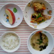 ごはん 鮭のチャンチャン焼き かぼちゃのそぼろ煮 味噌汁 果物(リンゴ)
