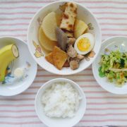 ごはん おでん 小松菜とキャベツのジャコ和え 果物(バナナ) チーズ ※果物のみかんがバナナに変更になりました。