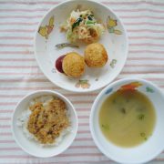 ひき肉納豆ごはん 里芋のコロコロチーズ揚げ 小松菜のツナ和え 味噌汁 小魚