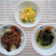 ひき肉とナスの甘辛丼 春雨サラダ ワカメスープ 小魚