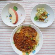 ミートスパゲティー ゆで野菜サラダ 果物(リンゴ) 小魚