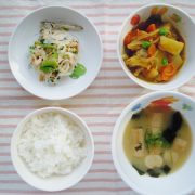 ごはん カレー肉じゃが 小松菜のツナ和え 味噌汁 小魚