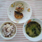 鮭と枝豆の炊き込みご飯 里芋のコロコロチーズ揚げ キャベツのごま酢あえ 味噌汁