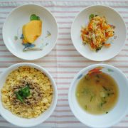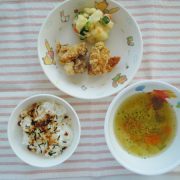 ☆お誕生日会☆ ふりかけごはん 鶏肉の唐揚げ マセドアンサラダ カレー風味の野菜スープ