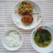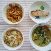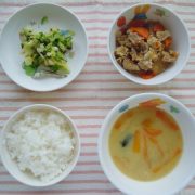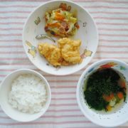 ごはん チキン南蛮 キャベツとベーコンの炒め煮 コンソメスープ 小魚