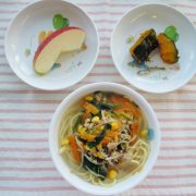 みそラーメン かぼちゃの煮物 果物(リンゴ) 小魚