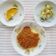 ミートスパゲティ ゆで野菜サラダ 果物(オレンジ) 小魚