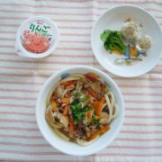 ☆粉河保育園と合同メニュー☆鶏ときのこのあんかけうどん シュウマイ 付け合せ(ブロッコリー) ゼリー 小魚