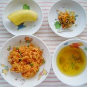チキンライス 三色サラダ 果物(バナナ) 小魚