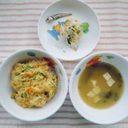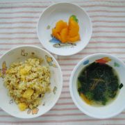 ☆自由保育☆五目チャーハン 小松菜の中華スープ 果物(ミカン缶) 小魚
