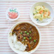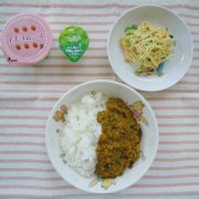 ☆自由保育☆夏野菜たっぷりキーマカレー スパゲティーサラダ ちゅるるん(0.1.2歳児) いちごムーズ(3.4.5歳児)小魚 ※予定していた果物(····