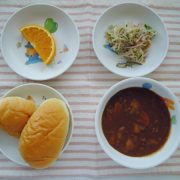 ロールパン ビーフシチュー 三色サラダ 果物(オレンジ) 小魚