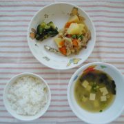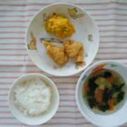 ごはん チキン南蛮 かぼちゃサラダ コンソメスープ 小魚