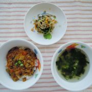 ひき肉とナスの甘辛丼 ほうれん草ともやしのナムル 春雨スープ 小魚
