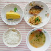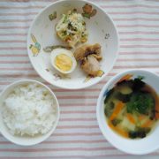 ごはん 鶏肉とゆで卵のさっぱり煮 小松菜のツナ和え 味噌汁 小魚