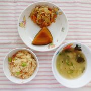 鮭と枝豆の炊き込みご飯 豚肉の生姜焼き かぼちゃの甘煮 味噌汁