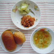 ロールパン トマト煮込みハンバーグ 粉ふき芋(青のり) コンソメスープ 小魚