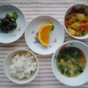 ☆給食参観☆ 麦ごはん カレー肉じゃが カリカリきゅうり 味噌汁 果物(オレンジ)