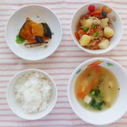 ごはん 豚肉じゃが かぼちゃの甘煮 具だくさん味噌汁 小魚