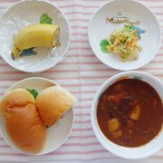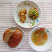 ロールパン タンドリーチキン エビとブロッコリーのサラダ アスパラとベーコンのスープ 小魚